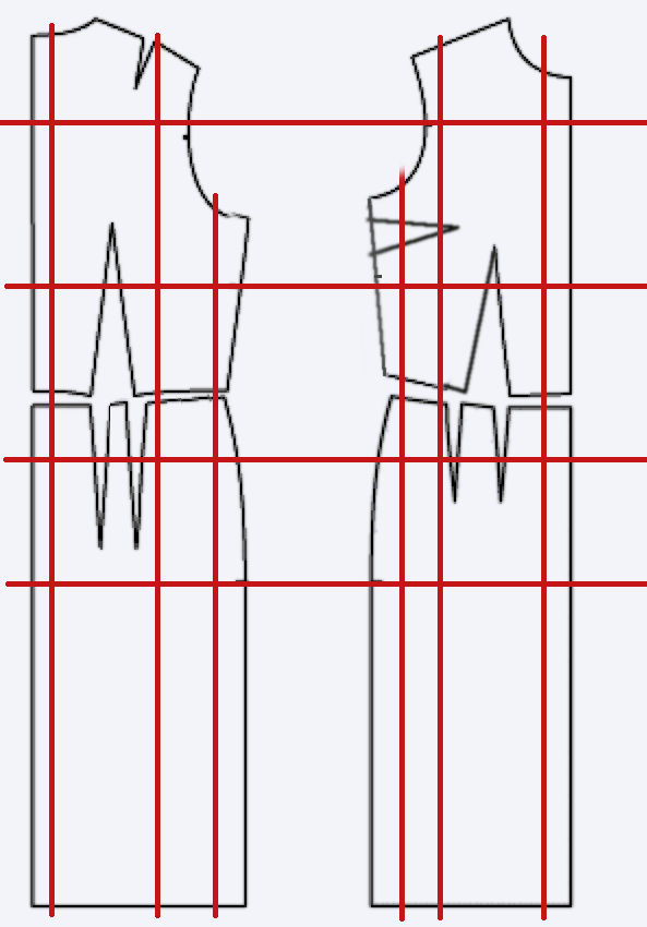 Resizing was remarkably easy – my 1950s era “Successful Dressmaking” book gave some fairly simple guidelines: something along the lines of slash along the red markings (image below) and increase or decrease as needed.
