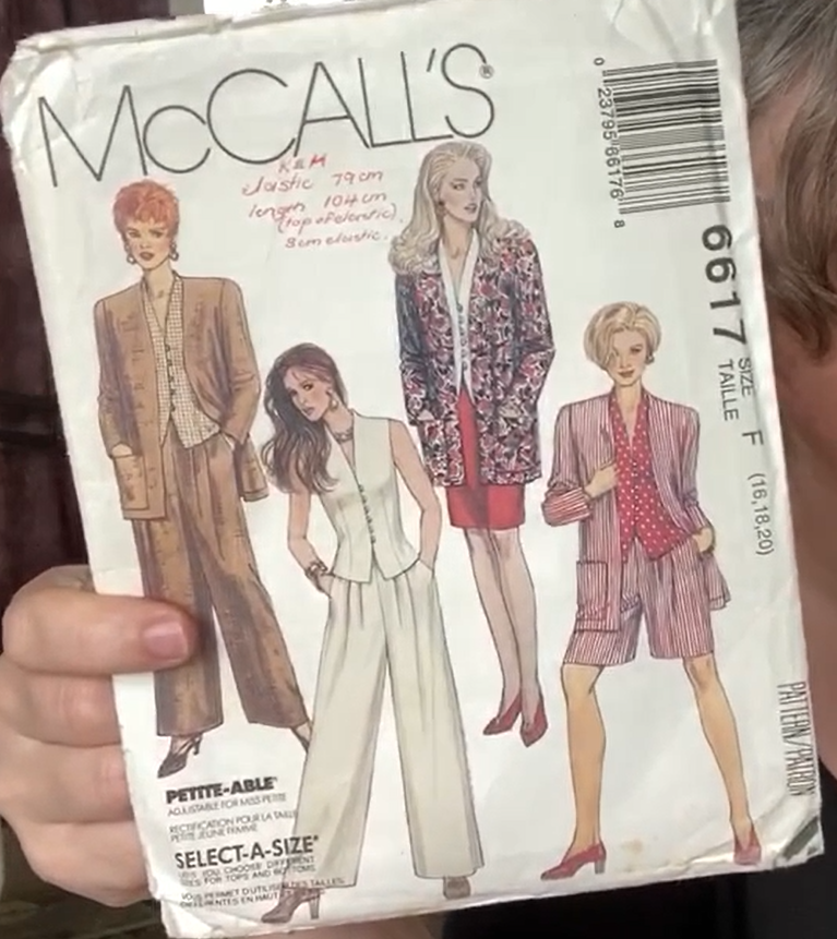 So, when I decided I needed a pair of work trousers with a vintage feel – this seemed like the perfect place to start. To help get a feel for what the average woman would have been making for her wardrobe, I headed to the Vintage Pattern Wiki and discovered the lovely Vogue 9016 from 1945. A Sears and Roebuck catalogue pic from the 1940s provided further inspiration, but of course, neither gave me a pattern to work from. So what could I do, but raid my stash of 1980s/90s patterns to see if there was something I could adapt. I picked out two patterns from the 1990s, both McCall’s – 8560 & 6617. I managed to “Frankenstein” the two patterns together and came up with something that resembled the vintage vogue trousers.
